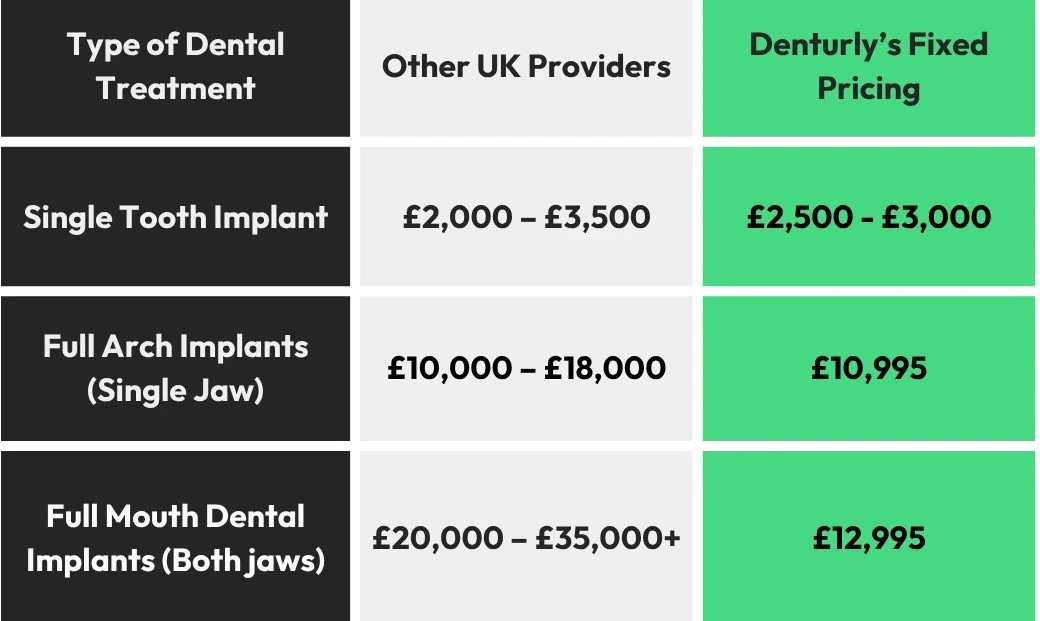 Discover the real cost of full mouth dental implants in the UK — what’s included, what affects pricing, and why Denturly provides the UK’s lowest-cost, high-quality care.